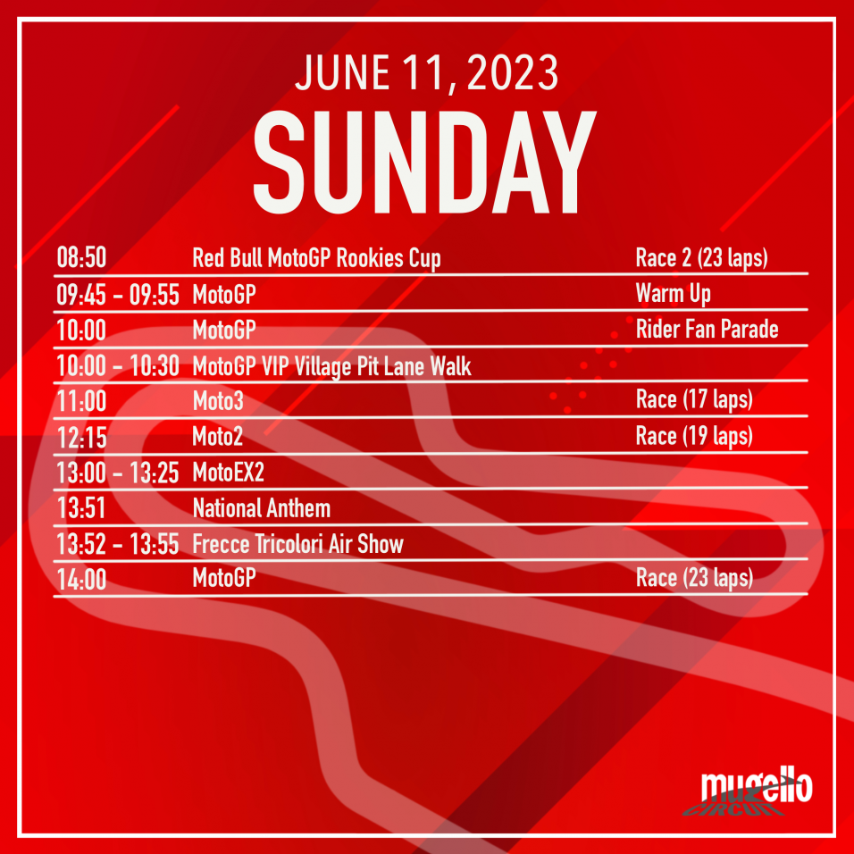 Ma la festa del Gran Premio d’Italia non si ferma con la bandiera a scacchi. Domenica 11 giugno sarà un pieno di emozioni con i duelli in pista della Moto3, Moto2 e MotoGP.  Con la bandiera a scacchi della classe regina, come da tradizione torna l’invasione di pista con i tifosi con l’apertura dei cancelli affinché i tifosi possano calcare la lingua di asfalto del tracciato toscano che pochi minuti prima è stato teatro di battaglie con il coltello tra i denti nella lotta alla vittoria.