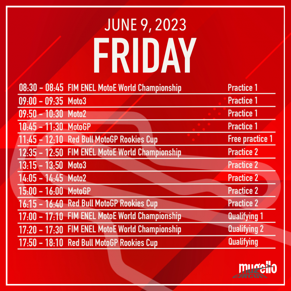 Tre giorni di pure divertimento in pista e fuori.  Otto le gare: Moto3, Moto2, MotoGP, Sprint Race al sabato e doppia gara di MotoE, doppia gara della Red Bull Rookies Cup.